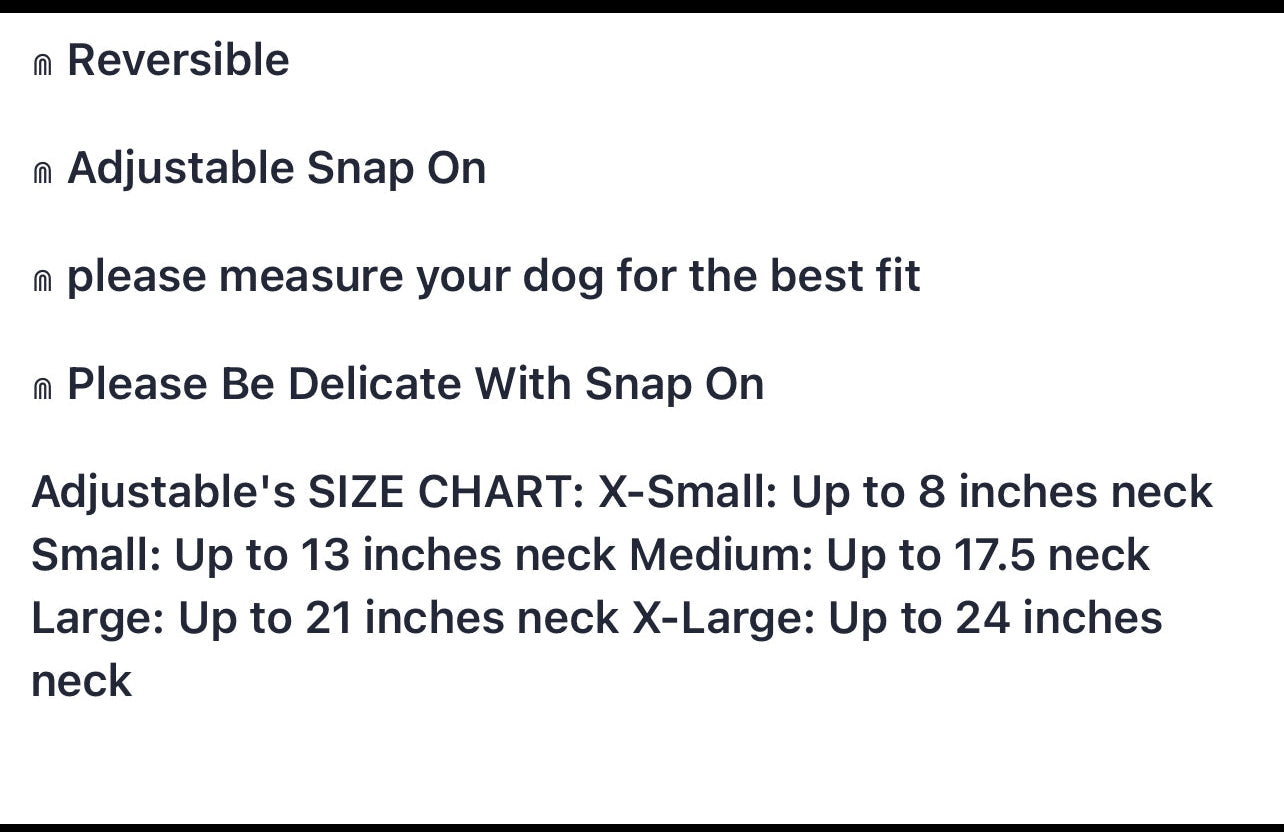see chart for sizing reference.  Adjustable and reversible w/snaps.